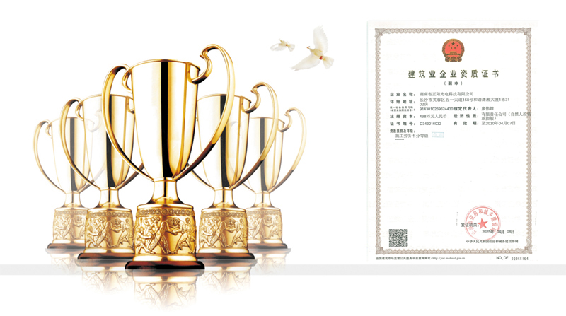 湖南省正陽光電科技有限公司是一家從事亮化工程及大型燈光藝術的設計、制作、安裝和維護于一體的專業化公司。公司資質齊全、管理嚴謹、技術先進、實力雄厚,取得了城市及道路照明工程專業承包壹級資質、照明工程設計專項甲級資質、機電工程施工總承包貳級資質、施工勞務等資質、國家高新技術企業、國家“重質量·守誠信”示范企業。